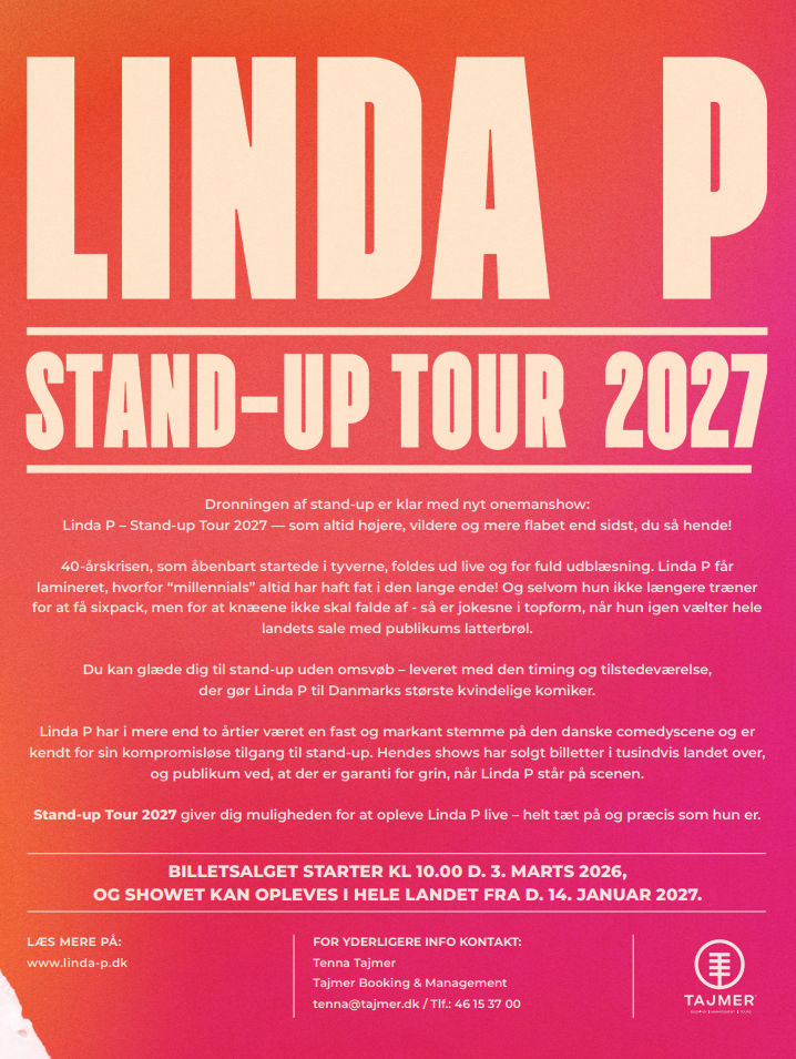 Dronningen af stand-up er klar med nyt onemanshow: Linda P – Stand-up Tour 2027 — som altid højere, vildere og mere flabet end sidst, du så hende!